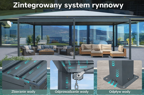 Pergola posiada wbudowany system rynien, który skutecznie zbiera wodę z zamkniętych lameli i odprowadza ją wewnątrz konstrukcji do nóg pergoli. Dzięki temu woda spływa kontrolowanie do podłoża, zapewniając komfort użytkowania nawet podczas deszczu.
