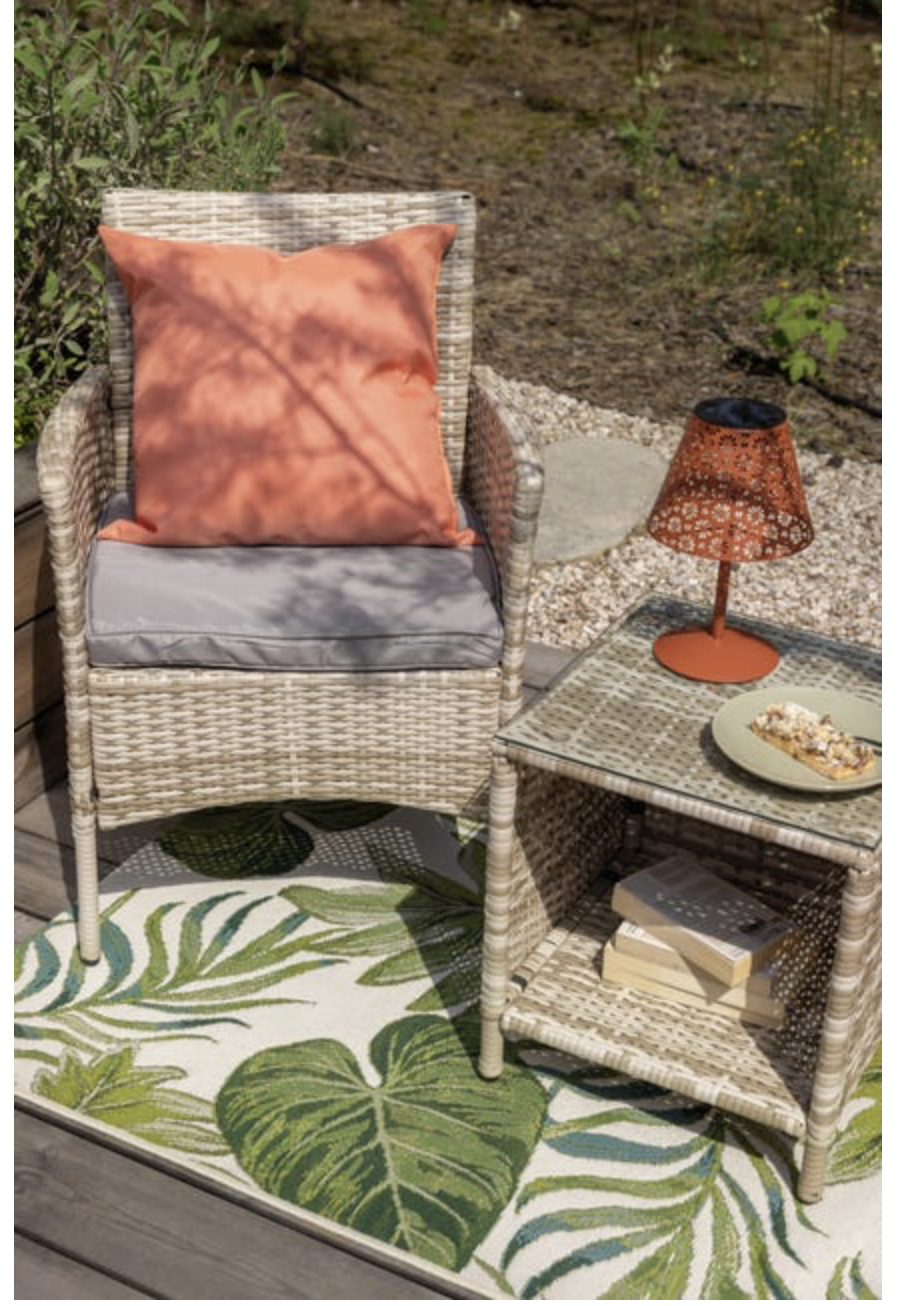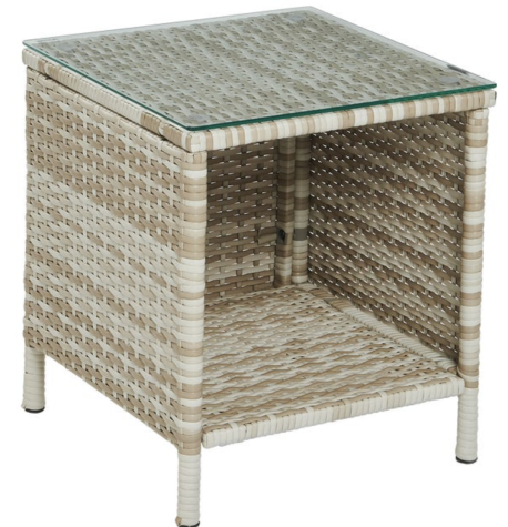 Wykonane są z syntetycznego rattanu, który jest trwały i odporny na zmienne warunki atmosferyczne. Stolik o wymiarach 40x45x40 cm posiada stalową konstrukcję oraz szklany blat, co dodaje mu nowoczesnego charakteru. Kolor beżowy, w jakim utrzymany jest zestaw, wpasowuje się w różne style aranżacyjne, dodając przestrzeni ciepłego, naturalnego odcienia.