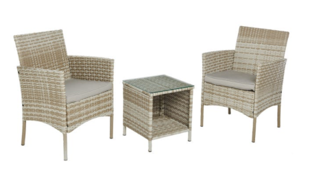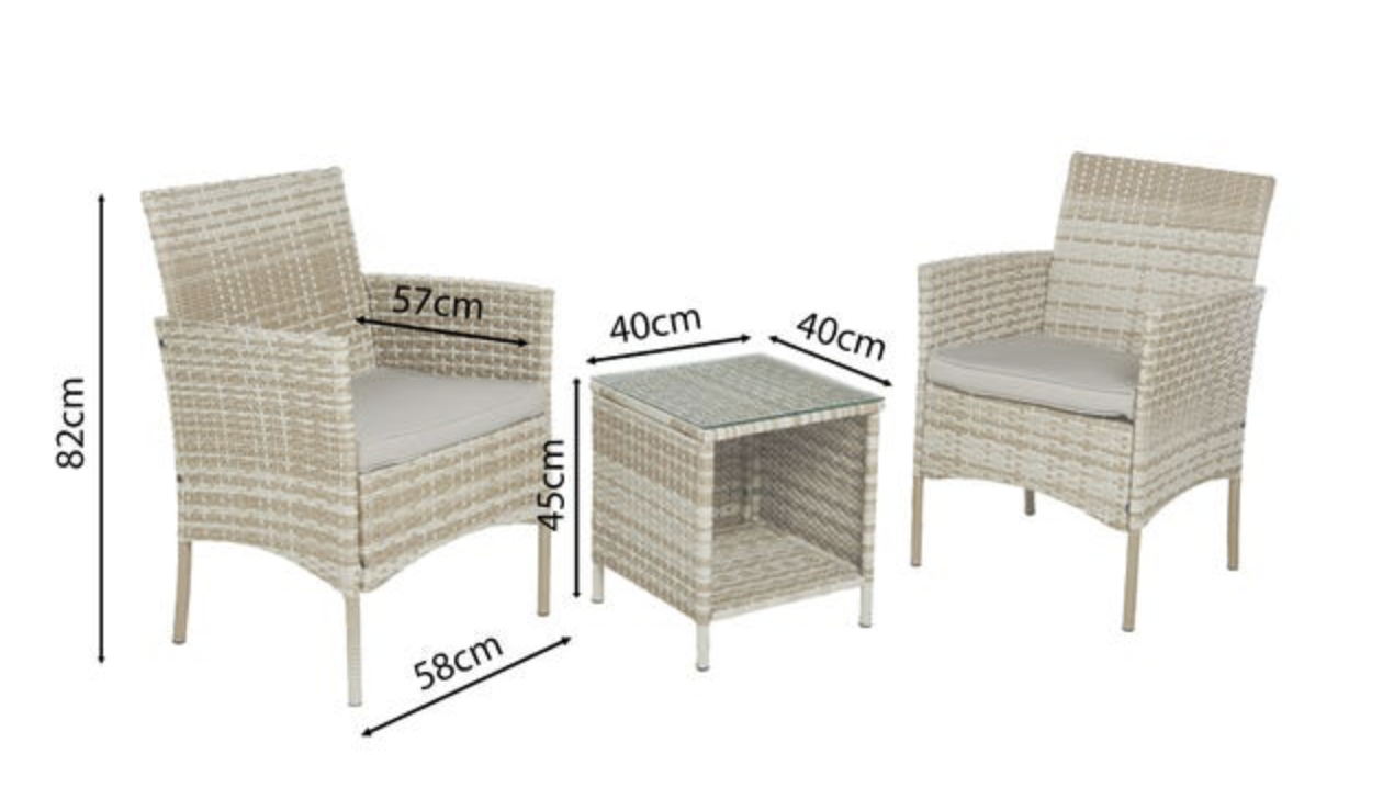 Zestaw składa się z dwóch foteli oraz małego stolika, co czyni go idealnym do stworzenia przytulnego kącika do relaksu na tarasie lub w ogrodzie. Fotele mają wymiary 58x82x57 cm, zapewniając wygodę podczas odpoczynku.