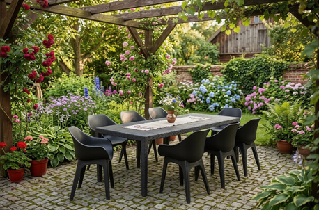 Stół i krzesła są idealnie przystosowane do warunków atmosferycznych.  Stół można poddać transformacji odejmując środkową część stołu i przekształcając go w kameralny stolik. Dzięki poszerzonemu zestawieniu mebli, można organizować wspólne posiłki i wielkie przyjęcia. Prosta bryła krzesła i stołu sprawiają, że staje się uniwersalne do każdego typu wnętrza ogrodowego. Wytrzymały materiał polipropylenowy pozwala bez wątpienia zakwalifikować je do produktów najwyższej jakości.