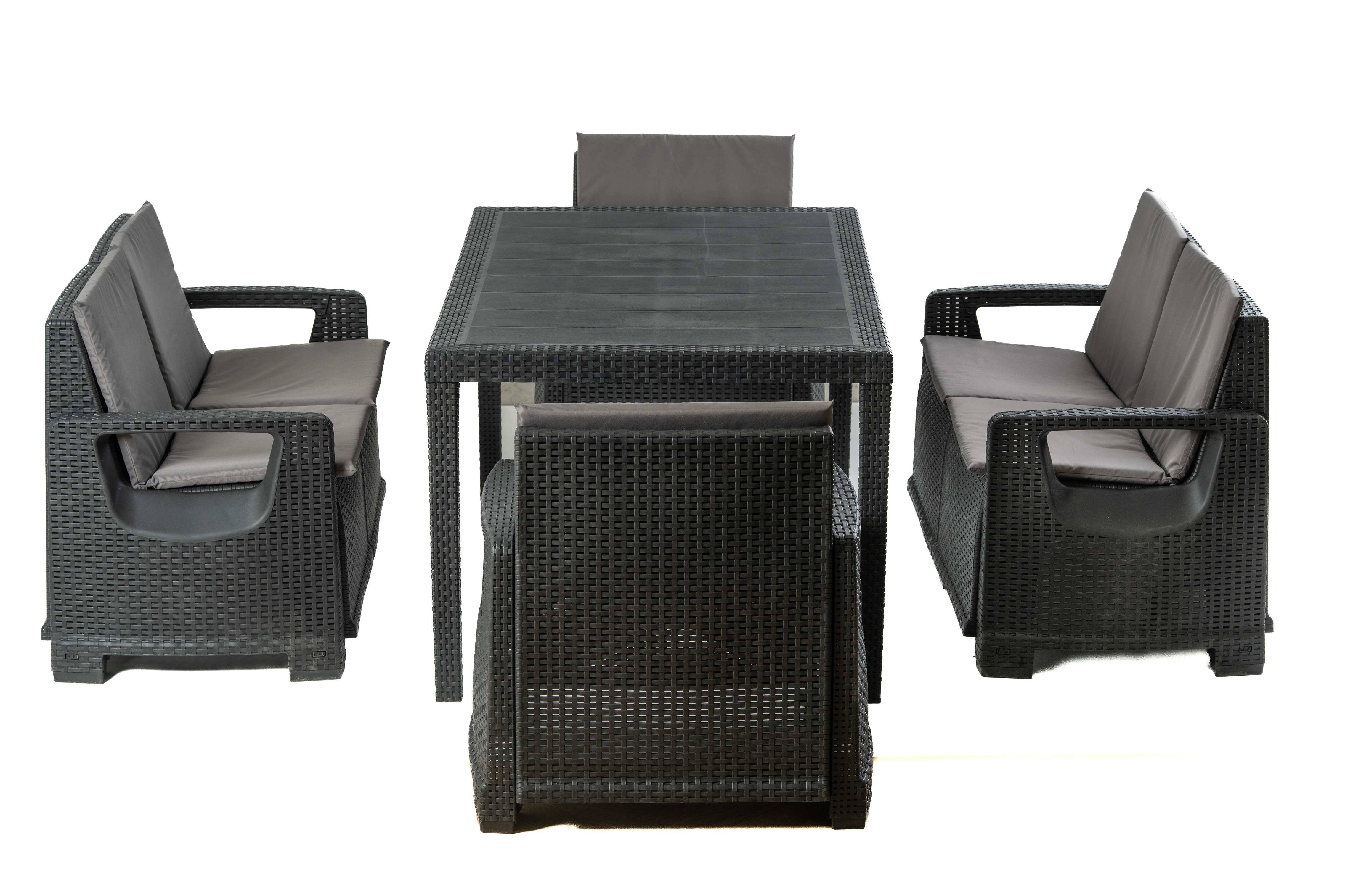 Aby zachować nieskazitelną trwałość materiałów, meble należy umieścić pod zadaszeniem. Zestaw jest dostępny z poduszkami w kolorze szarym. Materiał poduszek jest łatwy w czyszczeniu i odporny na wilgoć po odpowiednim zaimpregnowaniu.