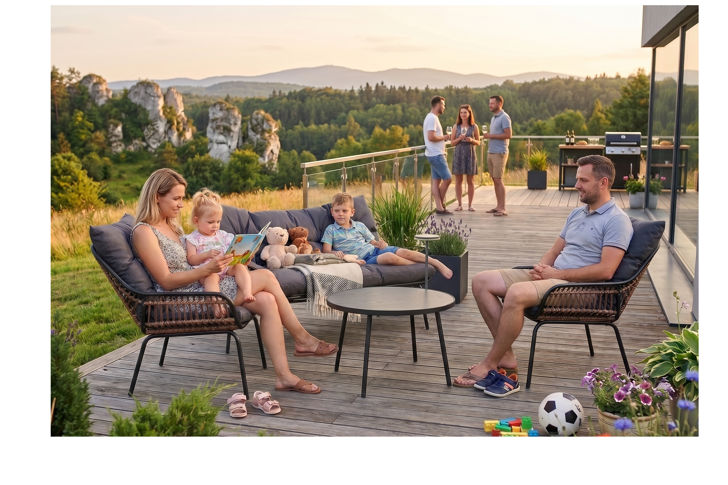 St Miguel sprawdzi się w wielu aranżacjach. Aby zachować nieskazitelną trwałość materiałów, meble należy umieścić pod zadaszeniem.