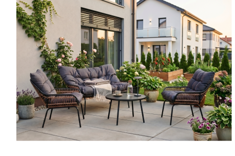 Zestaw został wyposażony w stolik kawowy oraz 2 fotele i sofę. Solidne wykonanie elementów gwarantuje komfort użytkowania. Nowoczesny design podnosi estetykę otoczenia i doskonale współgra z wnętrzem ogrodowym.